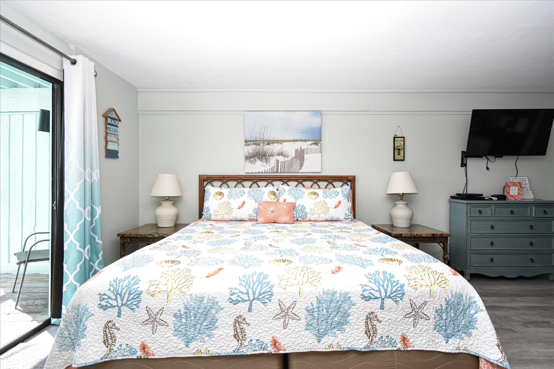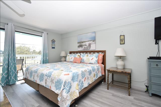 This lovely room offers you a king sized bed with a futon sleeper sofa for your additional guests. The kitchen has a 4 burner stove, microwave, coffee maker, toaster and refrigerator. See you soon! (2nd floor not wheelchair assessable)