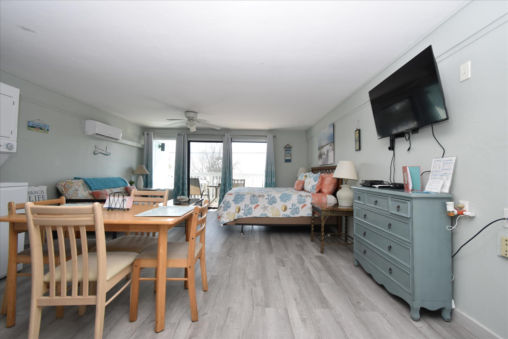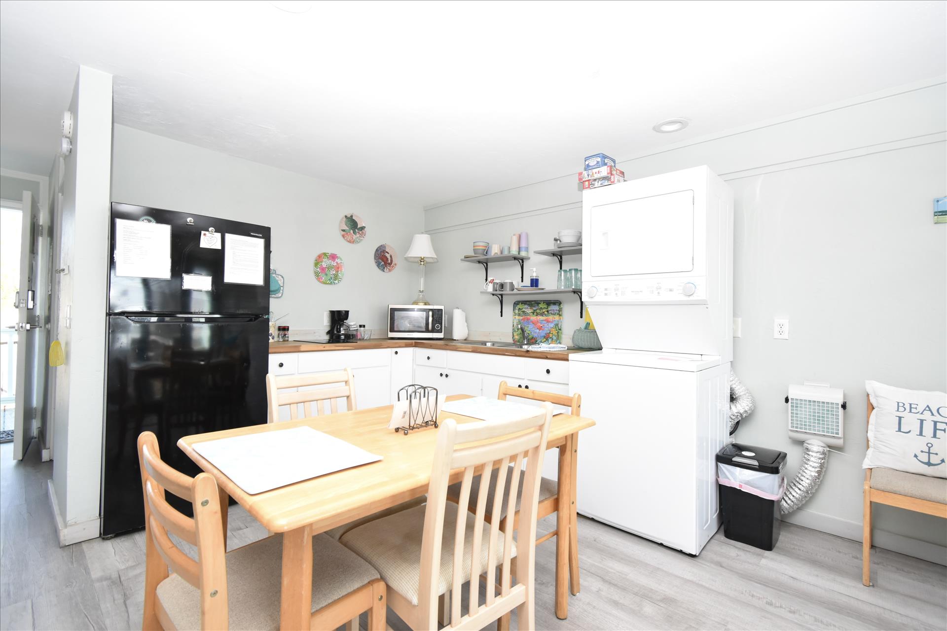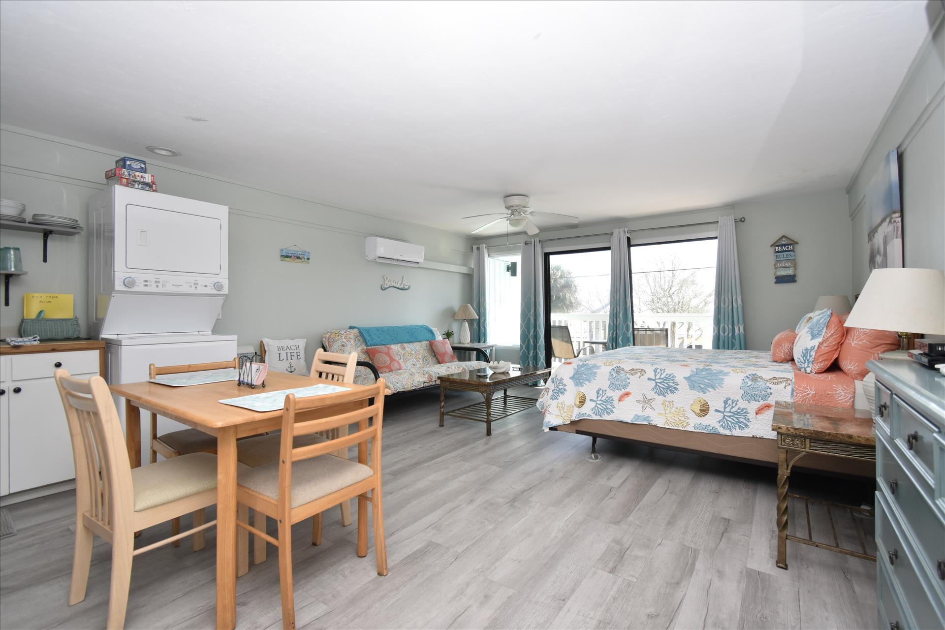 This lovely room offers you a king sized bed with a futon sleeper sofa for your additional guests. The kitchen has a 4 burner stove, microwave, coffee maker, toaster and refrigerator. See you soon! (2nd floor not wheelchair assessable)